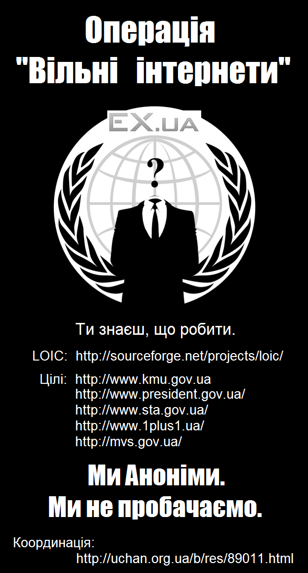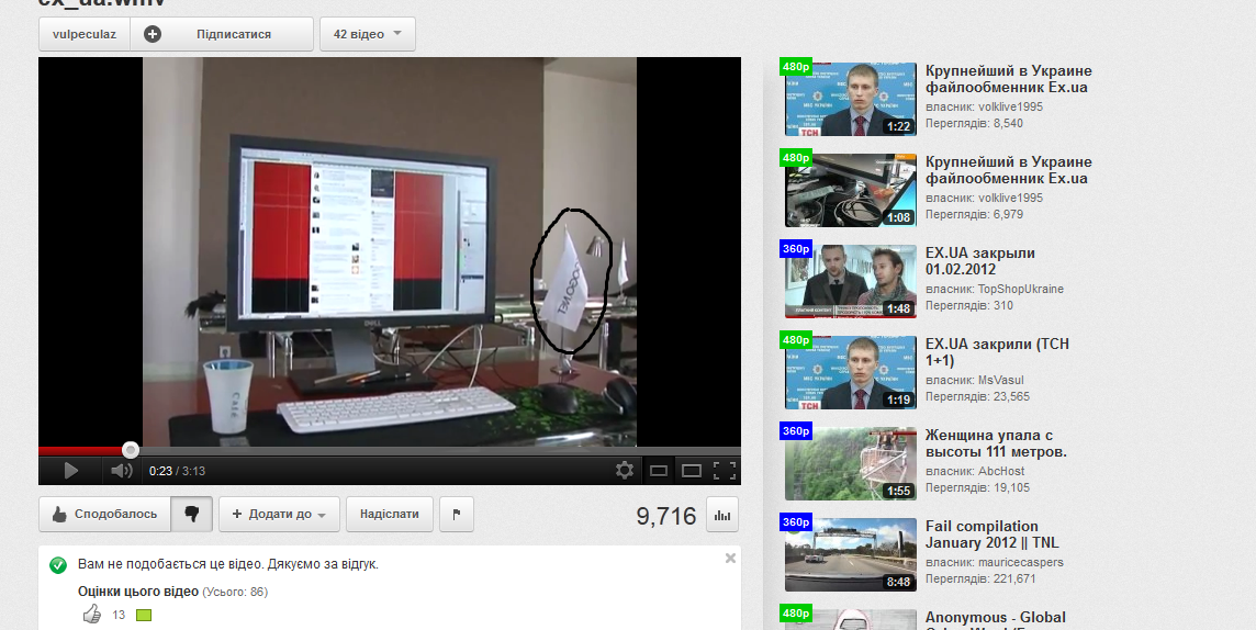 Ніякий офіс екс.юа не обшукували. Насправді то був офіс сайту megogo.net, вони також були партнерами ex.ua. Доказів з цього приводу декілька: на нараді виступала жіночка, представилася юристом megogo.net і заявила, що міліція була саме в їхньому офісі і тд., але за досить дивних обставин, її показали лише на СТБ.