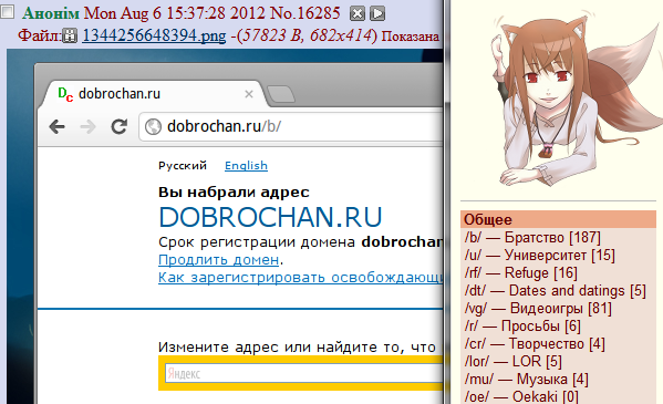 А ще у них повний технічний аскетизм. Форма швидкої відповіді? Розгортання зображень в пості? Ха-ха, та там навіть посилань на сусідні дошки вгорі сторінки немає — лише фрейм. Сайт, здається, оптимізовано під IE. І так у них, японців усюди. Усі сайти надзвичайно примітивні. Плюс, у них або дуже багато борд, або у них більшість форумів анонімні. І все такі ж населені і такі ж технічно бідні.